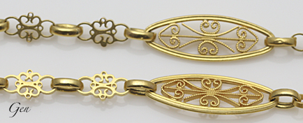 楕円形のパーツは、繊細精緻なミルが打ってあり、しかも表裏とも全く同じ細工です! マシンメイドは耐久力がないので、厚くまた太くせざるえないので、全体にごつい感じになるのです! もし、現代のチェーンでこういう繊細なチェーンがあったら10年も経たない内に切れてしまうでしょうね。 アンティークのハンドメイド・チェーンが100年もの時を経てもびくともしない耐久力があるのは、地金を叩いて鍛えた金の板にしてから作ってあるからです!! それに何百個もあるパーツを一つ一つ手で蝋付けしてあるのでなおさら耐久力があるのです!! 手作りのチェーンは手触りも違います。 |