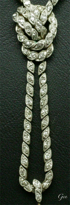 このチェーンは、パーツをマーキーズ型にしてつないでいるので、美しく見えるし、しなやかな動きになるのです! 正方形や長方形のパーツを使った物はたまに見かけますが、このようなマーキーズ型は、僕は初めてです! 縁に打たれたミルも、もちろんエドワーディアンの最高水準です! このマーキーズ型のパーツは、プラチナの薄い板とゴールドを蝋付けして作ってあり、ミルまで打ってありますが、一つだけでも手間が掛かるのに、これを何と100個近くも使っているのです!!! 美しいのには訳があるのです!! 独創的なアイデアと高度な技術、それに良い物を作ろうとする情熱がなければ、こんな手間の掛かる細工はしないものですよ!! 真珠を下げるための金具まで、同じマーキーズ型のパーツで湾曲した物が使われています。 僕は、細部にわたって気を遣った作者のセンスの良さと、絶対に良い物を作ろうという情熱を感じますね。 石だけが魅力のハリーウインストンのダイヤモンド・ジュエリーに比べて、このネックレスがどんなに美しいか!♪そして価格は何分の一なんですから、だから僕は優れたアンティークジュエリーほど、安い物は無いと言っているのです!! |
