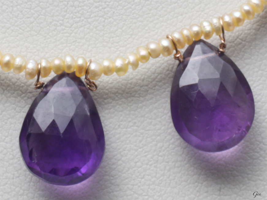 | アメジストの上部に横から穴を貫通させて金線を通して留めるという独特の留め方がインド風なのです。 |