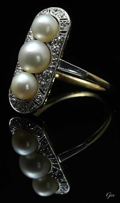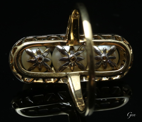 | 三個の天然真珠は少し埋め込んでセットして美しく見える工夫が見られます。 | |