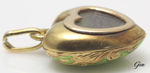 | イエローグリーンの発色が美しいギロッシュエナメルのロケットペンダントです♪ 小ぶりで、ハートシェイプがとてもキュートです♪♪ キュートなだけではなくサイド部分に細かい彫金が施されていて、作りもしっかりとしています!! 珍しいパターンの地模様がイエローグリーンのエナメルから浮かび上がり何ともいい雰囲気です♪ ギロッシュ・エナメル(バスタイユ)についてはエナメルの技法でご覧ください。 |