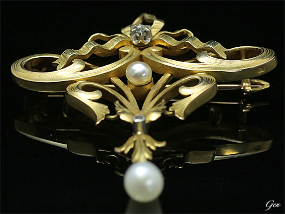 アールヌーボーならではの優美な曲線のフレームに、細く美しい線が彫られています!♪ 下に下がった天然真珠もドロップ型の良い形ですし、上質でコンディションも良好です!♪ これで20万円を切る価格はグッドプライス!♪ |