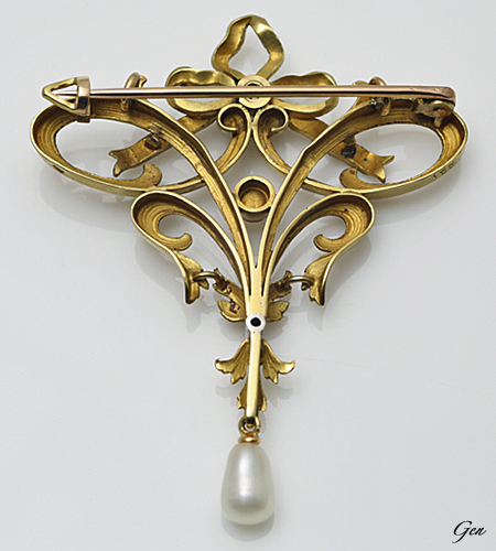 アールヌーボー ゴールド ブローチ ゴールド、天然真珠、ローズカット・ダイヤモンド フランス 1890年〜1900年頃 大きさ 5.0cm×4.0cm 重量 7.9g ¥188,000ー |