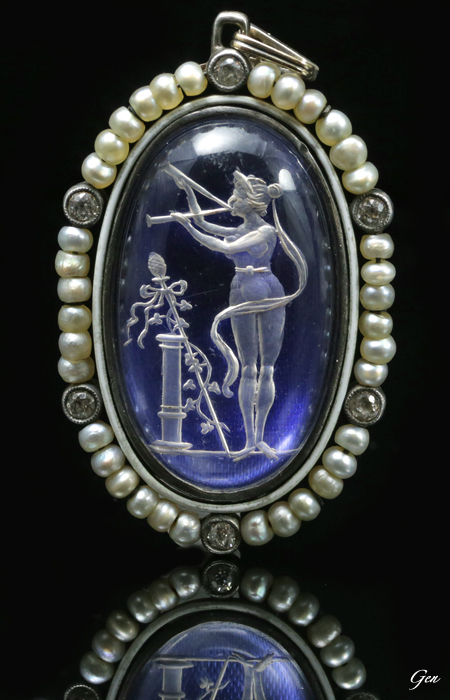 水晶の裏からインタリオを彫ったリバースインタリオとしては、滅多に見ないハイクラスの物です!!♪ インタリオの下にブルーの布をしいてあるので、光の当たり方でバッカンテが浮かび上がるファンタジックな美しさがあるのです!♪」 |