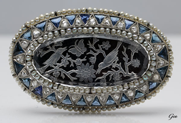 楕円形の水晶の裏側に陰刻(リバースインタリオ)を施したもので、彫りが綺麗に見えるようにオニキスを下にセットしてあります。花鳥風月の図柄はシノワズリー(中国趣味)の影響を受けていることがわかります。 周囲のトライアングルカットのサファイヤは、アールデコを予感させるもので、丁度開発されたばかりのシンセティック・サファイヤを使っているのもその時代の証です。 そして天然の真珠だからこそ100年近くの歳月を経ても美しさを保っているのです。 |