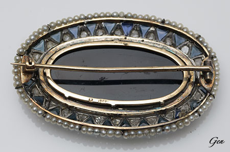 裏には黒いオニキスのカバーが掛けてあってインタリオの彫りがよく見えるようになっています・ 裏の枠の部分はゴールドになっています。 ピンにはストッパーがついた当時の最新の物。