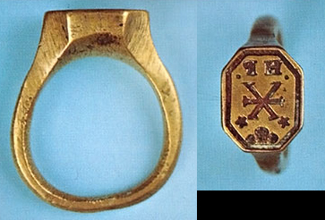 大学学長のリング ドイツ 1620年 ポメラニアン州立美術館 親指に嵌めるリング。ポメラニアン公爵の紋章とイニシャルが彫り込んであります。 |