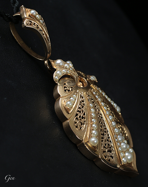 『透かしの美』 ハーフパール(天然真珠) ペンダント フランス 1880年頃 ハーフパール(天然真珠)、18ctゴールド 6cm×3cm(バチカンを含む) 重量9,8g Sold 立体的な美しい形! 唐草模様の繊細優美な透かし! バチカンまでもが透かしを入れた凝った作り! グラデーションのハーフパールはすべて当時のままの良い状態! これはハーフパールを使った最上位のジュエリーです! |