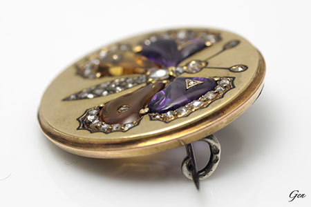ハイレベルのアメジストとシトリンそれにローズカットダイヤモンドの蝶は、一目見た時に心に焼き付く美しさを感じます。 |
