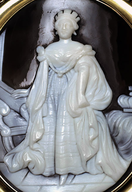 1830年ぐらいから拡大したシェルカメオの分野ではイタリアが先行していましたが、19世紀中期には生産拠点はパリに移ります。1851年のロンドン万国博のシェルカメオの展示品リストには、イタリアの作家に混じってイギリスの作家の名も見えます。古典的なテーマに加えて同時代の政治家や絵画を題材にしたカメオは好評を博しています。 ヴィクトリア女王をジュエリーのデザインにすることは当時よくあり、不敬などとはあまり考えられていなかったようですが、女王からの下賜品のミニアチュールや勲章用のカメオ以外では珍しいです。このカメオは女王の熱烈なファンが作らせたものでしょうか? ヴィクトリア女王の特徴を捉えた顔を彫っていますが、顔の部分はたった5ミリ程しかないことを考えれば、とても良い彫りだと言えます! |