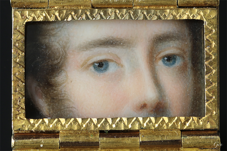 | この素晴らしい細密画は、アイ・ポートレイト(アイ・ミニアチュール)又はラバーズ・アイと言われており、離れていても、恋人に見つめられているような想いがするのが人気のポイントだったのです。プリンス・オブ・ウェールズ(後のジョージ4世)が、彼の「目」の肖像画と 1785年 11月3日の日付が入ったプロポーズの手紙をマリア・フィッツハーバートに贈っています。