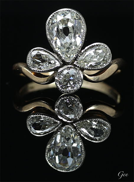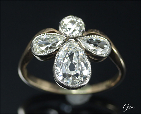 | ペアシェイプ オールドヨーロピアンカット・ダイヤモンド リング イギリス 1890年頃 ペアシェイプ オールドヨーロピアンカット・ダイヤモンド、 オールドヨーロピアンカット・ダイヤモンド、 18ctゴールド、シルバー センターストーン 1カラットオーバー サイズ 7号(13号までは変更可能) 重量 2,2g Sold アンティークジュエリーでは、ペアシェイプのオールドヨーロピアンカットは極めて珍しい物です!! しかもゲージで測ると(円形ではないので、あくまでも目安)、1カラットオーバーの大きなダイヤモンドです!! 現代のダイヤモンドのペシェイプカットに比べて、オールドヨーロピアンカットのペアシェイプは、石に厚みがあるので、より美しいファイヤー(虹色の光)とダイナミックなシンチレーションがあるのが特徴であり魅力です!! 普通のカットでも1カラットオーバーとそれ以下では、産出量が全く違うので、1カラットオーバーの石は別格なのです! |