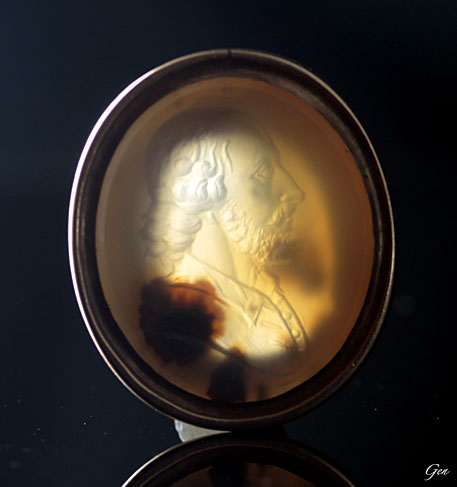 独特の苔メノウの質感を活かした幻想的なインタリオはモチーフのシェークスピアに相応しいものです!! |