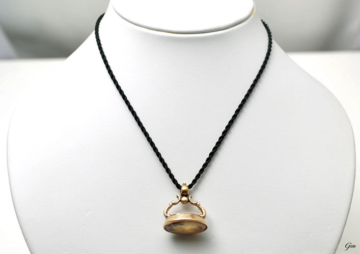 インタリオはオープンセッティングになっています。 カボッションカットのような曲面になっていて、アゲートの模様が見えるのがいいですね。 |