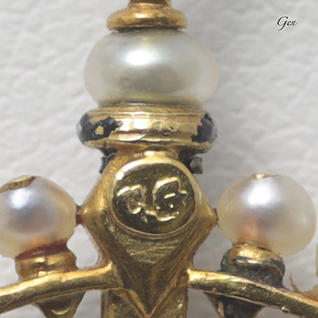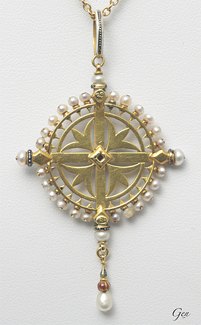 下に下がる部分には雫型の真珠を使い、それを留めている部分を彫ってアクセントとしての赤いエナメルを入ています。その上のほんの小さな部分にも青いエナメルに白い浮き上がったエナメルが施されていますが、肉眼では見えないほどの繊細至極のエナメルなのです!! |