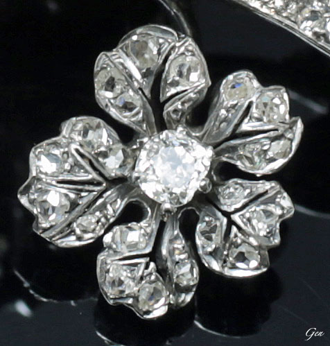 色々な形の花があります。 この部分も、大きい石はオールドヨーロピアン・カットになっています。 透明度もあります。 |