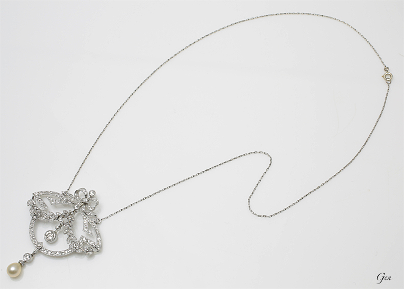 メアンダー模様とガーランドスタイル(ルイ16世様式)のコラボのデザインは、エドワーディアンの洗練されたイメージに、 メアンダー模様は、古代ギリシャ時代からある様式の文様ですが、それをそのままに使用するのではなく、大胆にアレンジを加え、ス タイリッシュで遊びのある斬新なデザインの一部として巧みに取り込ん であるのが初期アールデコのジュエリーらしいところです! エドワーディアンからアールデコの過渡期に作られた可愛いフォルムのネックレスですが、ダイヤモンドと天然真珠は上質の物が使われています! |