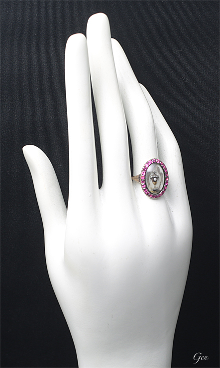 | ハイクラスのモーニング リング イギリス 1779年 ルビー、ローズカットダイヤモンド、天然真珠、象牙?、細密画、ガラス、ハイキャラットゴールド(15〜18ct) ベゼル 1,5cm2cm× サイズ 11号(変更可能) 重量 4,1g ¥655,000- ガラスのカバーの中には、象牙に描かれた柳の細密画があり、その上に直径1mmにも満たないような極小のローズカットダイヤモンドと天然真珠がセットされた骨壺がありますが、18世紀という古い年代のモーニング・リングならではの魅力です!♪ ベゼルにルビーがセットされている贅沢な作りは、この指輪の持ち主が貴族だった証でしょう。 1779年と刻まれていて、はっきりと年代が解るのもモーニング・ジュエリーの魅力です!♪ |
