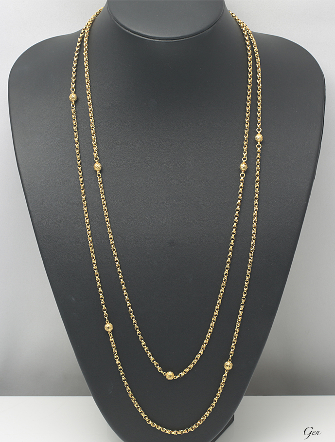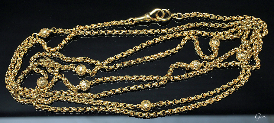 | 金の色がとても良いですし、ボールにも模様が彫金されているのが素晴らしい!♪ 鎖は細い金線を絡ませた繊細で美しい物です!♪ 150cmもの長さのロングチェーンでハンドメイドなんて、現代では手間が掛かりすぎるので、絶対不可能です!! もし、作ったとしたら軽くこの5倍もの値段になってしまうでしょう!! |