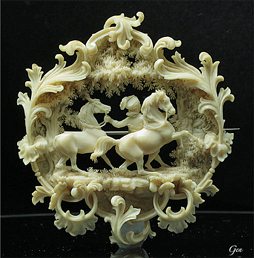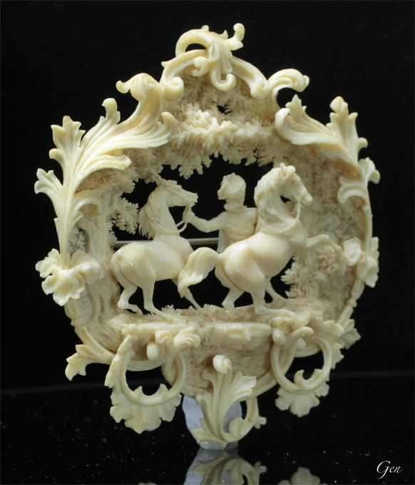 これだけの繊細な細工の物は一見付けるのが怖いとさえ思われるかも知れませんが、繊細な彫りの足や角は内側で、上部の木の枝は繊細に見えても縦に厚みがあるのでそれほど神経質にならなくても充分身につけて楽しめると思います。形ある物はいつかは壊れるのが当たり前なのです。どうせ壊れるのなら本当にその魅力を知る人の胸で命絶えた方が良いのではないかと僕は思いますね・・。 多くの方はこんなに繊細な彫りの物は怖くて付けられないと言われますが、黒のベルベットのドレスの胸元に付けたら、高価なダイヤモンド・ジュエリーにも負けないと思います!♪ こういう作品は使わない時は額にセットして飾って楽しまれるのが良いと思います。有名画家のリトグラフなんかよりずっと良いと思いますね。額装は見積もりをお出し致します。 ※左の馬の尻尾が欠損していますが、これだけの希少価値のある繊細な彫りなので、この価格なら充分許せる範囲のことだと思っています。 |