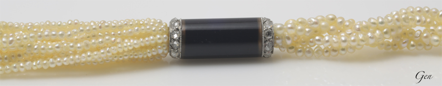 | 5,100もの天然真珠を使った膨大な手間を掛けて作られたこのソートワールは、歴史上、天然真珠が最も人気が高く、高価な物だったからなのです!! でも残念なことにミキモトの養殖真珠の輸出が本格的に始まり、そのその量が増える1920年代後半から、天然真珠を使った美しいジュエリーが姿を消して行き、やがて全く姿を消してしまうのです。 |