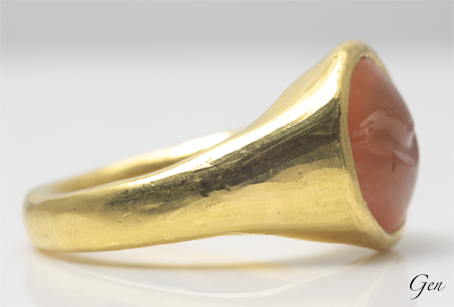 半透明の石をカボションカットにしてあるので、光の当たり方で綺麗に輝き、イルカが浮かび上がるんです!!♪ これは本当に楽しい指輪です!♪ 僕は同じぐらいのサファイヤやルビーの指輪より、こういう古代ローマの美しいインタリオ・リングの方がずと楽しいと思います!!♪ 自分で使いたくなっちゃてます(笑)。 |