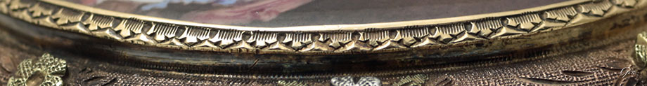 内側の枠にも素晴しい彫金がしてあります!! 魚のヒレのような模様を一つ一つ彫金して作っていますし、その余白にも三角形にカットしています。 こんなところにまで手間を掛けた4カラーゴールドのフレームが付いているものは滅多にありません! 中の細密エナメル画にはサインが無いとはいえ、フレームに相応しい高いグレードの物だということが解るのです!! |