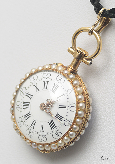 エナメル ミニアチュール ペンダントウォッチ スイス 1880年頃 エナメル ミニアチュール(細密画)、シードパール(天然真珠)、18ctゴールド、 直径 2,2cm 厚み1cm 重量 13,1g Sold フェイス(文字盤)が1円玉より小さい、コロンとしたとっても小さくて可愛いのが魅力のペンダントウォッチ!!♪ 女性用の腕時計が作られるようになる1930年代になると、小さな時計は珍しくありませんが、19世紀の時計としては、このような小さい時計は非常に珍しい物で、高級な時計として作られた物なのです!! この時計はトップレベルの腕の時計師にオーバーホールを依頼しますが、その時計師は、この時計のムーブメント(機械)は、とても高級な良い物だと言って頂いています!! オーバーホールして、痛んでいる部品を取り替えて、作られた当時の精度に近い(24時間の誤差が2〜3分ぐらい)ところまでにすることが出来ます。 アンティークの時計のオーバーホールは、腕の良い、良心的な仕事をする時計師に頼まないと、返って壊されることさえもあるのです! 唯、分解して油を差すだけで、オーバーホールしたという時計師が多いのです! そんな中途半端なオーバーホールでは、もとの精度までは戻りませんし、段々時間が合わなくなり、時計の寿命も早く終わってしまうのです! この時計の価格は完璧なオーバーホール代込みの価格です。 オーバーホールに出してから半年かかりますが、その代わり安心してお使い頂けます。 尚、オーバーホール前に時計の代金をお支払い頂き、半年後にオーバーホールが済んだ時計をお渡しすることになりますので、その点はご了解ください。 |