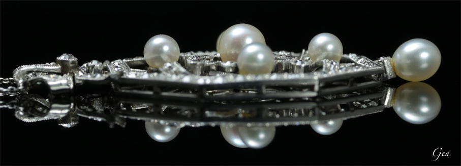 | このネックレスは、最も小さなダイヤモンドを含めてすべてのダイヤモンドが、ローズカットではなく、シングルカットのオールドヨーロピアンカット・ダイヤモンドがセットされているのが特徴です! 多くの物は、小さなダイヤモンドはローズカットを使っているのですが、このネックレスのようなトップレベルの物は、ローズカットではなく、オールドヨーロピアンカット・ダイヤモンドを使っているものなのです(一部に例外はありますが)。 小さなダイヤモンドを連続して留めてあるので、その繊細な輝きは実に美しく、天然真珠の引き立て役にピッタリなのです! 小さくても高品質のダイヤモンドが使われていますし、石留めの技術が歴史上頂点だった時代ならではの細工なので、繊細で且つ完成度の高さを感じる高級感があるのです! |
