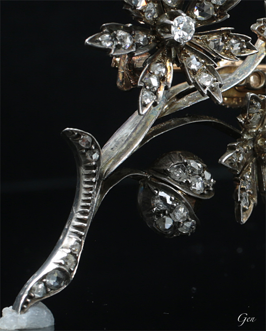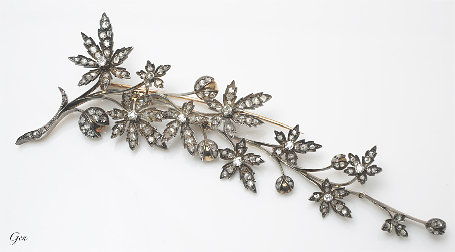 トレンブランは、フランス語で小枝のような物が揺れる様子を表す言葉です。 トレンブラン・ブローチは、花びらなどが裏に付いているコイル状のスプリングで優雅に揺れるのが特徴です。 トレンブランのジュエリーは、19世紀初期頃に最初の流行があり、その頃はシードパールを使った物なども作れられています。 このトレンブラン・ブローチが作られた1870〜1880年頃は、南アフリカからのダイヤモンドが豊富に出回り、ダイヤモンドラッシュが始まった頃で、ダイヤモンドの人気がいっそう高まった頃です。 花びらに留めてあるダイヤモンドは、オールドヨーロピアンカット・ダイヤモンと言われるタイプで、厚みがあるだけに揺れる度に美しいシンチレーション(ダイヤモンド特有の輝き)が楽しめます!♪ トレンブランは揺れれば良いという物ではありません。 トレンブランは大きく分けて二つの揺れ方があり、スプリングの構造も違います。 一つはゆらゆら揺れる(動きが大きい)タイプで、これは大きめのコイル状のスプリングが露出しています。 もう一つは時計のゼンマイのように左右に僅かに廻るような揺れ方で、震えるような繊細な揺れ方です。 皆さんは、スプリングを使って揺れるのなら今でも作れるだろうと思われるかも知れませんが、今のトレンブランは揺れ方がアンティークのトレンブランが壊れて補修した物のようなぎごちない揺れ方になってしまっています! アンティークのトレンブランは、たぶんスプリングの材質自体が特殊な合金で、今では手に入らない物だと思いますし、揺れさせる物の重さや大きさの微妙なバランスがあるのだと思います。 時代を経て渋さの魅力を感じる銀の台に、古(いにしえ)の輝きを放つダイヤモンドの花びらの繊細な揺れので、それに魅了される人は多く、アンティークのダイヤモンド・ジュエリーの中では絶大な人気があるのが、トレンブラン・ブローチです!♪ このトレンブランはとても美しいフォルムで、19世紀中期のジュエリーとは違う洗練されたエレガントな雰囲気を感じます。 何の花かは分かりませんが、花びらや葉の作りはとても繊細精緻なものです! 当時はどのように付けられたかは分かりませんが、今なら背中を大きく開けたイヴニングドレスの肩の下あたりにパッドを入れて、そこに左の画像のように大きな花びらを上にして下に流れるように小さな花びらの部分が下がるように付ければ、きっと満場を魅了することでしょう!♪ 今の日本ではイヴニングドレスを着るシーンは少ないとは思いますが、僕はウエディングドレスに付けたらきっと一生の思い出になるのではないかと思います!♪ このトレンブランは、二つに分かれるので、小型のトレンブラン・ブローチとしても使える優れ物なんです!♪ 下の拡大画像を見て頂きながら細部の説明を致しましょう。 《参考》 |