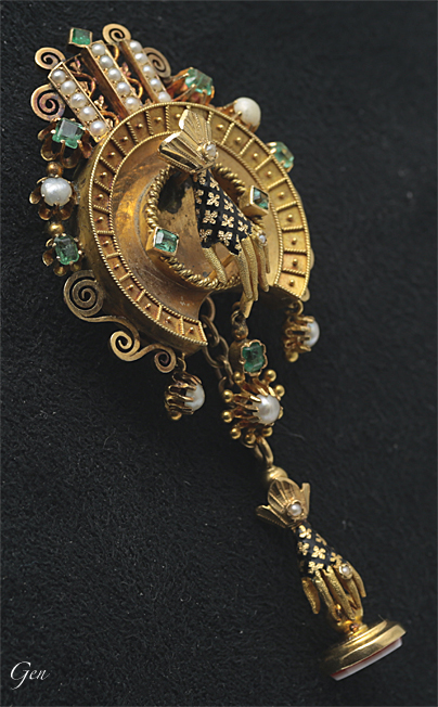 | 極めて細い金線の珍しい縒り線の上に付けられた手のモチーフは、カーブドアイボリーとジョージアンのクラスプ以外では極めて珍しい物です!! それにブラックエナメルに多数の小さなクロスをあしらったデザインはフレンチならではのセンスを感じます!♪ 指にはめている指輪には、直径1mmにも満たない極小の真珠を丁寧に留めてあり、指には、日本の金工における魚子(ななこ)と同じような、無数の小さな点をタガネで打って艶消しにしてあります!! このブローチは現代にジュエリーのようにデザインの魅力だけのジュエリーではありません!! 19世紀のアンティークジュエリーならではの見事な金細工も見所なのです!! |