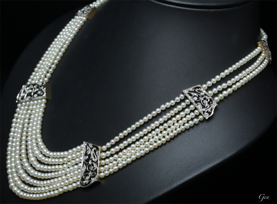 | 膨大な数の天然真珠はすべてが色も照りも素晴らしく、そのうえ全部が揃っているのには驚きです!!!! 大中小の6個の美しい金具を付けたデザインも、エドワーディアンならでの洗練されたエレガントなものです!! これだけ沢山の天然真珠をオールノットで結び目が穴に入って見えない糸替えも素晴らしい!! 天然真珠に付いては『天然真珠の魅力』をご覧ください。 |