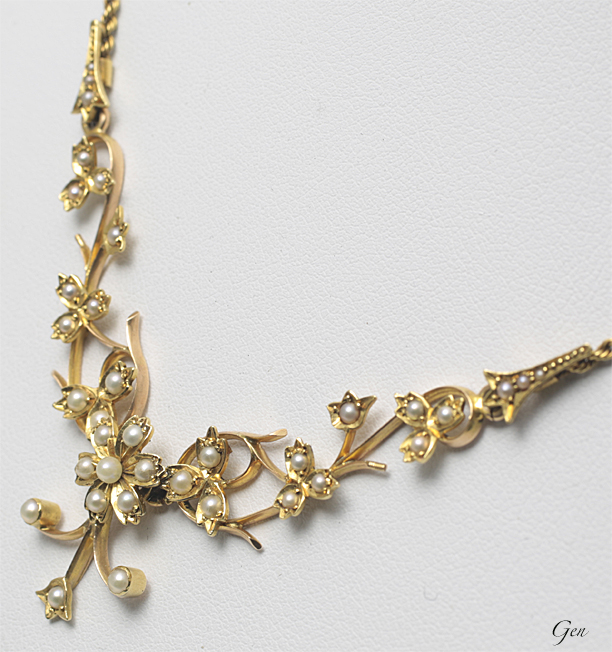 シードパール ネックレス イギリス 1880年〜1900年頃 シードパール(天然真珠:ハーフパール)、18ctゴールド、 ハンドメイドチェーン 31cm(真珠が付いた部分も含めば36cm) 重量 9g Sold 19世紀後期のシードパール ネックレスとしては、ハイレベルのネックレスです!♪ 大半が15ctゴールドなのに、これは18ctゴールドで全体の作りの完成度の高いとても良い作りです!! それにチェーンもハンドメイドの見事な作りのチェーンですし、クラスプのオリジナルの物が付いているので言うこと無しですね!♪ 小さな天然真珠を半分にカットしたハーフパールを使っているので、フラットで繊細な美しさを感じるのです。 ハーフパールの留め方も丁寧にしっかり留めてあります。 コンディションもとても良いです! 天然真珠と養殖真珠に違いについては、詳しくは 《知られざる天然真珠の魅力》でご覧ください。 |