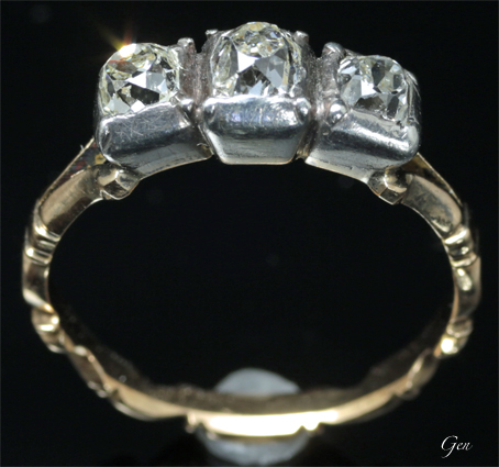 | 約200年前のダイヤモンドらしいラフなカットですが、これだけ拡大してもインクルージョンが見えない、とても上質なダイヤモンドであることが分かります!! この時代のほとんどのダイヤモンド・ジュエリーは、クローズドセッティングで石の下に箔を敷いてありますが、それはまだダイヤモンドの産出量が少なく、上質な石がとても少なかったからなのです。 そんな中でこれだけクリーンで、上質のダイヤモンドをオープンセッティングにした指輪は大変貴重な物なのです!!!♪ |