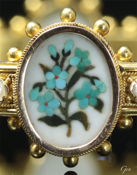 『驚異の細工:美し過ぎるピエトラドュラ』 ピエトラドュラ(フローレンス・モザイク) バングル イタリア 1860年頃 ホワイトマーブル(大理石)、アゲート、トルコ石他天然石、ルビー、 天然真珠、18ctゴールド 内径 約16cm モザイクの大きさ 1,4cm×1cm 8個 重量 20,6g Sold 1円玉より小さなフローレンスモザイクで、これだけ細密で美しい作品は、この40年間で唯の一つも見たことがありません!! これはマイクロ フローレンス・モザイクと言うべき極めて貴重な作品です!!! これはミュージアムピースと言える素晴らしい作品なので、二度と出会うことの無い絶品です!!! |