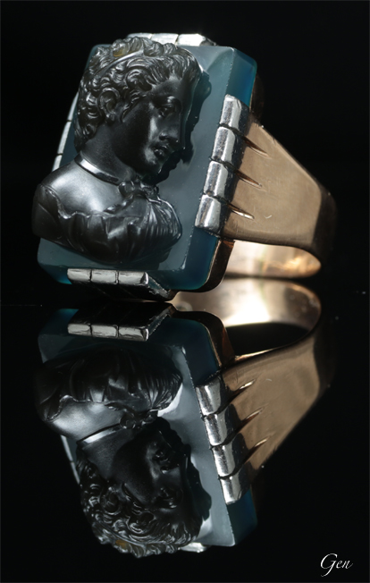 | ハードストーン カメオ リング カメオ(アゲート):イギリス又はフランス 19世紀 シャンク(14ctゴールド&ホワイトゴールド):アメリカ 1950年頃 2cm×1,4cm×0,8cm 重量12,2g サイズ 約15,5号(変更可能) Sold このカメオは石がすご〜く珍しいんです!! 今まで見たことの色のアゲートです!! ベースの部分が青緑から黒に近いグレーのグラデーションの珍しい石です!! しかも厚みが0,8cmもあるんですからね〜! 最初、二つの石を貼り合わせてあるのかとも思ったのですが、これは完全二つの層を持つ一つのアゲートなのです!! 彫りも19世紀のトップレベルの素晴らしい物です!! シャンクがアンティークではないので、この価格ですが、もし、19世紀のシャンクだったら40万円台の価格にはなっていたでしょう!♪ |