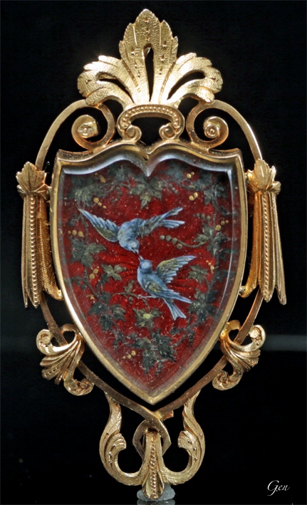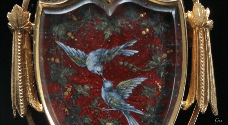 | ギロッシュエナメルの色は明るい赤ではなく、ちょっとダークな赤なので、二羽の小鳥が美しく浮かび上がるのです!♪ 二羽の小鳥は実に美しいグラデーションのエナメルです!♪ |