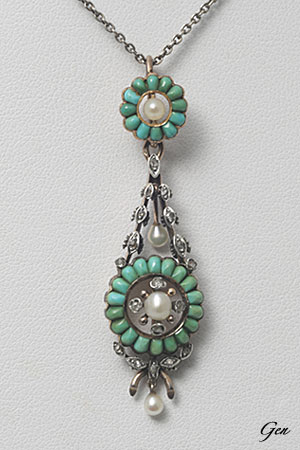 トルコ石は紫外線で退色する性質があり、これもグリーンに変わっていますが、これも約120年もの時を経た証しと言えるもので、これもアンティークジュエリーの味わいと言えるものだと思います。 |
