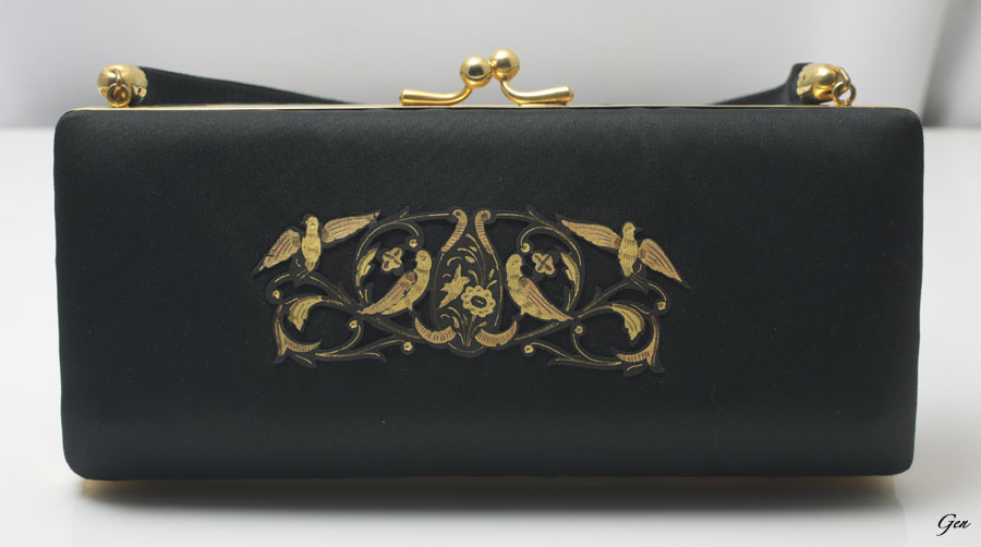 バニティバッグ フランス?1930年代頃 布、メタル 大きさ20.0cm×9.0cm×5.0cm 持ち手の長さ29.0cm ¥40,000- 黒地に金の鳥のモチーフがよく映えたおしゃれなバニティバッグです。 今のファッションにも合わせやすく使い易いです。 コンディションがとても良いです。 |