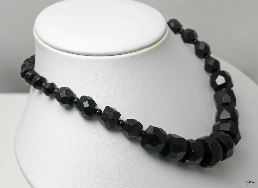 | ウィットビー ジェット ネックレス イギリス 1860年頃 ウィットビー産ジェット(黒玉) 全長 41.0cm 重量 36.5g Sold このネックレスはグラデーションになっていて程よいボリューム感がありますのでとても着け映えがします。 漆黒のウィットビージェットのカット面が動くたびきらきらと輝いて美しいです。 普段使いのシンプルな装いにもフォーマルにも色々なシーンで使って楽しめるネックレスです。 |