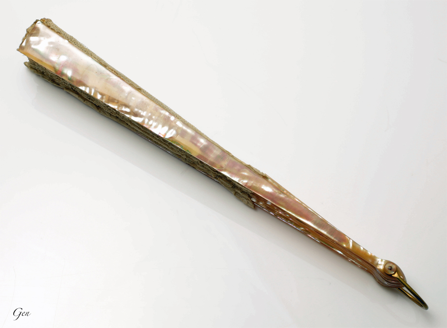 19世紀の繊細で美しいレースの扇!♪ マザーオブパールも普通の物ではなく、光の当たり方で変化する実に美しい物が使われています!♪ きっと貴族の女性が使った扇でしょう。 扇の持ち方で言葉を伝える『扇言葉』があったようですし・・・。 これは使ってもよし、額装しても良しでしょう!♪ |