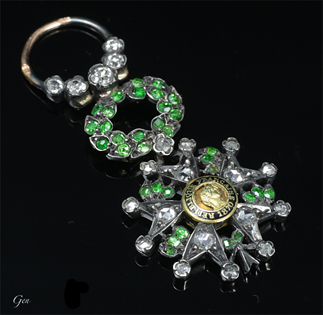 プチ勲章はエナメルだけの物より宝石を使った物が高位の勲章ですが、デマントイドガーネットとダイヤモンドをこれだけ贅沢に使っているということは、余程の高位の勲章として作られた物だと思います!