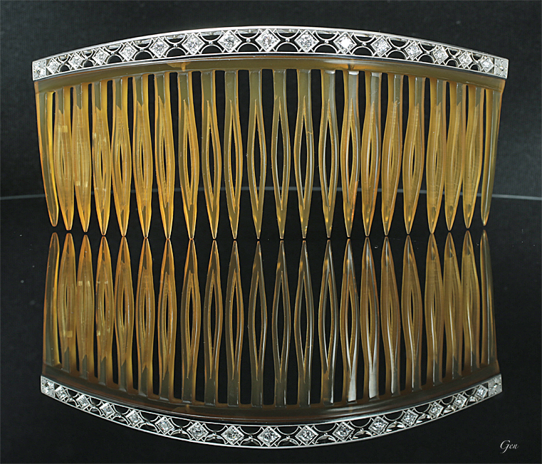 何とも美しい飴色のべっ甲の造形!!♪ このようなべっ甲は、大きな亀の甲羅の中でほんの一部しか取れない貴重な部分なのです!! そしてその中でも最上質の部分だけを使った、べっ甲の飾り櫛としては最高級の物です!! 上の縁のプラチナにダイヤモンドがセットされた部分には、エドワーディアン〜アールデコにかけての最高級のプラチナ・ジュエリーに勝るとも劣らない素晴らしいミルが打たれています!!♪ 和を感じる繊細な美しいプラチナの透かしと、見事なべっ甲細工から、これは1930年頃に日本で作られた物に違いないと思ってよ〜く見ると、裏に『芝翫香』のマークが入っていたので、大いに納得しました!! 「芝翫香」の歴史は、1813(文化10)年、歌舞伎役者・三世中村歌右衛門が、大阪・心斎橋筋「大丸呉服店」の向かいに、びんつけ油(商品名「芝翫香」)を取り扱う店を創業したことに始まり、時代とともに取り扱い品目は、眉はきや白粉、簪や櫛、笄などへと移り変わり、やがて明治に入ると、鼈甲、珊瑚などを使った飾り櫛を作るようになるのです!! この飾櫛は、1930年代(アールデコ)の物だと思いますが、同年代のフランスのトップレベルの物に勝るとも劣らない素晴らしい細工と造形です!!!♪ やはりべっ甲細工に関しては日本の方が上なんだなと関心してしまいます!!♪ こんなに素晴らしい髪飾りを作った「芝翫香」なのに、今では何の面白みも魅力も感じない、ごく普通のジュエリー(高いだけ・(笑))の会社になってしまっているのは残念です。 まあ、世界中のすべての有名宝石店もすべて同じでけどね〜(笑)。 |