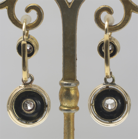 | オニキス&ダイヤモンド ピアス ウルグアイ? 1900年頃 オールドヨーロピアンカット・ダイヤモンド、オニキス、18ctゴールド、 2,2cm×1,1cm 重量 4,3g アンティークケース付き Sold デコのデザインを先取りしたような、当時としてはシンプルで斬新なデザインです!♪ |