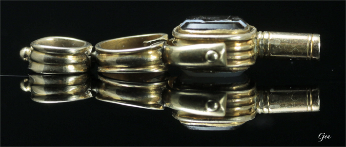 花と鳥 両面インタリオ ウォッチキイ イギリス 19世紀後期 アゲート、カルセドニー、15ct Aの状態で1.7cm×1cm 厚み 0.4cm 重量 1.5g ¥120,000- インタリオの大きさが0,5cm×0,7cmと、1円玉の半分以下しないとってもとっても小さなウォッチキイです!! でも両面インタリオで回転するんですから驚きです!!♪ 表にはカルセドニーにバラの花を彫り、裏にはバンデッドアゲートに「水を飲む鳥」を彫ってあります。 バラの花のインタリオは、これほど小さな物としてはなかなかの良い彫りです!! バンデッドアゲートのインタリオは、石を縦?にカットしてモチーフが縞模様の中に浮かぶような面白い視覚的効果を狙っていますが、これは紀元前の古代ギリシャやローマのインタリオのイメージで作っているからです!!♪ ウォッチキイは、鍵でネジを巻いた時計のカギですが、こんなに小さな物でこれ程凝った作りの物は初めてです!! きっと時計も小さな物で、よっぽど凝った作りの美しい時計だったのに違いありません!! |