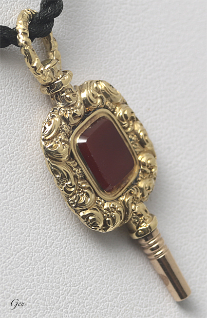 | コーネリアン ウォッチキイ イギリス 19世紀初期 コーネリアン、15ct 長さ 3.8cm 幅1.5cm 重量 4.6g SOLD この彫金はジョージアンの物の中でもスーパー ハイクラスです!!♪ 小ぶりなので、ペンダントとしても使いやすいのが良いですね!♪ |