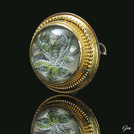 エセックス・クリスタルは、アンティークジュエリーの中でもとても面白みのある物ですが、カメオなどに比べてどんな技法で作られているのか以外に知られていません。 これを初めて見る人は、一見夜店で売っているようなプラスチックの中に何かが入っている物をイメージすようですが、それは大いなる勘違いというものです。 これは立体ガラス絵とも言うべき物で、まるでカメオが中に入っているように見えるのは、水晶の裏からインタリオ(沈め彫り)を彫り、彩色しているからです! これは実は大変高度なな技術と手間が掛かる仕事ですし、見た目には分かりにくいので、カメオのようにブームにならなかったし、20世紀初頭で完全に廃れてしまった技術です。 まず透明な水晶の裏にカメオとは逆に立体的にモチーフを彫ること自体がどんなに難しいことかを理解出来ないと、エセックス・クリスタルの魅力は理解出来ません! 透明な水晶にカメオのような彫りを陰刻するには、彫りを目で見て確認しながら彫れる訳ではないのです! 彫るだけでも非常に難易度の高いことなのに、さらに彫った部分を磨くのですがこれがまたとても手間の掛かる仕事です。 最後に彩色するのですが、これは言わば細密画のガラス絵と言えるもので、普通の絵とは逆にガラス絵のように手前から奥に描いてゆくのです! 詳細は《Essexcrystal エセックスクリスタル》でご覧ください。 |