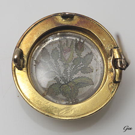 | エセックス・クリスタル(リバースインタリオ) ブローチ イギリス 1880年〜1890年頃 ロッククリスタル(水晶)、15ctゴールド 直径 2.0cm 重量 4.6g Sold シックなカラーで上品なバラのモチーフが彫られたエセックス・クリスタルのブローチです。 お洋服の襟元などにさりげなく着けるなどしてお使いいただける、とても小さくて可愛らしいブローチです♪ |