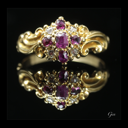 ルビーとローズカットダイヤモンドそれに粒金がミックスされたような、華やいだ感じのベゼルが印象的です!♪ でもこの指輪は何と言ってもシャンクのデザインと作りが素晴らしいんです!♪ 蝶の触覚のようなイメージの彫金を左右で、上下逆にしてあるセンスの良さには嬉しくなりますね〜!♪