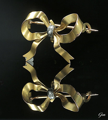 リボン ブローチ フランス 1900年頃 18ct、ローズカット・ダイヤモンド 3.1cm×2.4cm 重量 4.4g Sold 金の板を巧みに曲げて滑らかなリボンが見事に表現されたブローチです。 上品なサテン地を思わせるマットゴールドの仕上げがされています。 中央の結びの部分に上質なローズカット・ダイヤモンドがあしらわれていて光の当たり具合や角度が変わるたびにキラッと輝きこのブローチのとても良いアクセントになっています。 |